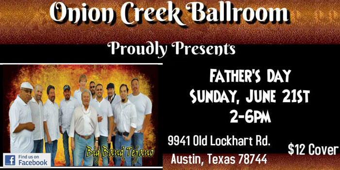 (AustinVida) – On Father’s Day, Sunday June 21, Big Band Tejano continues its Sunday tardeadas at the Onion Creek Ballroom. The Austin band will fill the southside event center with the sweet sounds of big brass section, Texas-sized vocals, and shuffling feet on the hardwood floor.