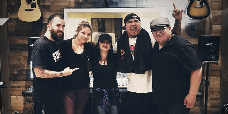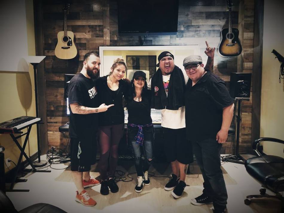 The photo features Shelly Lares, Siggno drummer Joey Jimenez and producer Eddie Perez of La Calma working on the collaboration in the very first session at the new Starboy Studios in San Antonio, Texas