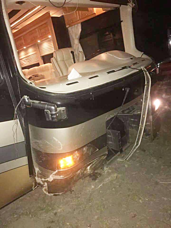Herrera was returning home after a performance in Lockhart, Texas when the driver lost control of the tour bus after the blown tire, ending up in a field just along IH-35 near the Schwab Road exit in Schertz, Texas. The RV’s windshield was obliterated when the vehicle impacted with road signs.
