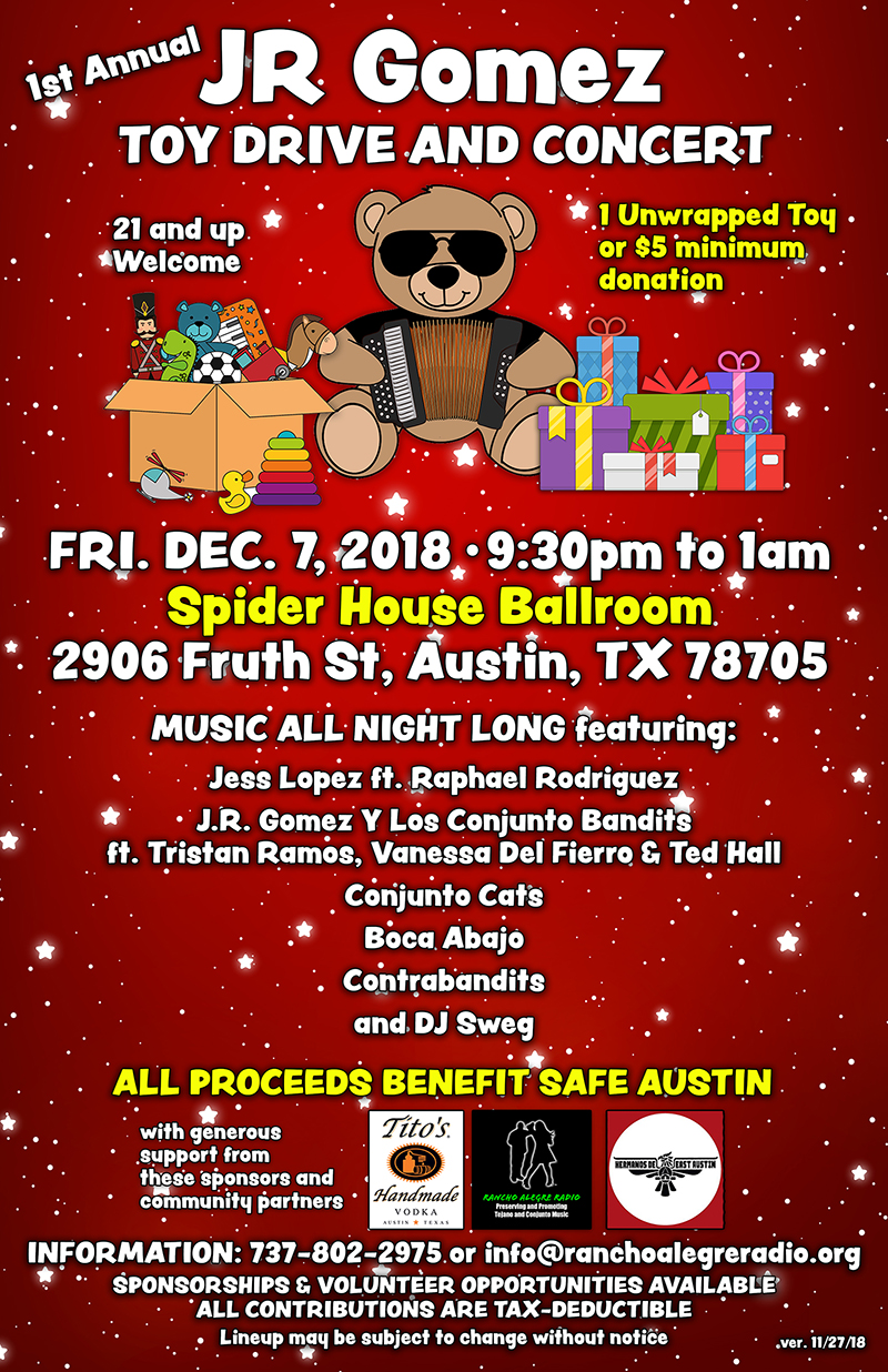 Austin, Texas — Multi-talented and award-winning musician J.R. Gomez will present his 1st Annual Toy Drive and Concert at the Spider House Ballroom in Austin on Friday, December 7. Proceeds from the event will benefit SAFE Austin, a nonprofit organization serving the survivors of child abuse, sexual assault and exploitation, and domestic violence.