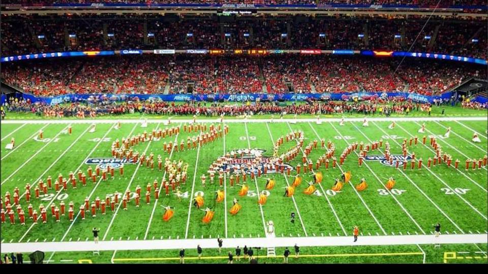 The University of Texas Longhorn Band, also known as the Showband of the Southwest, performed a special tribute to the Queen of Cumbia during the Sugar Bowl halftime show.
