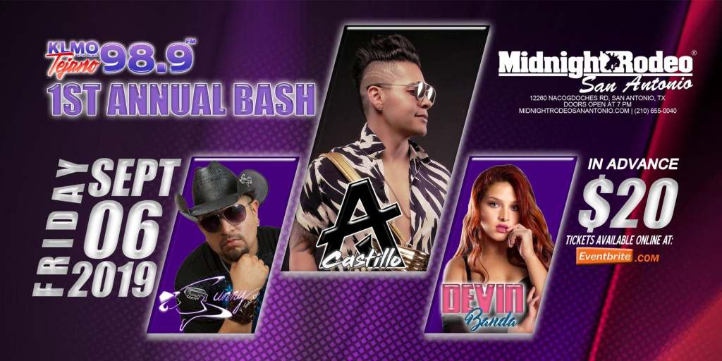 The new Tejano radio station in the San Antonio area is celebrating its launch with the KLMO Tejano 98.9 1st Annual Bash with AJ Castillo, Sunny Sauceda, and Devin Banda on Friday, Sept. 6 at Midnight Rodeo.