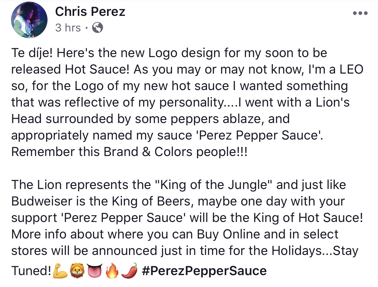 That scene actually happened and Chris is well known for carrying around a bottle of sauce for those added flavor moments. Well, now they are going to be that much more flavorful with the upcoming release of his signature Perez Pepper Sauce!