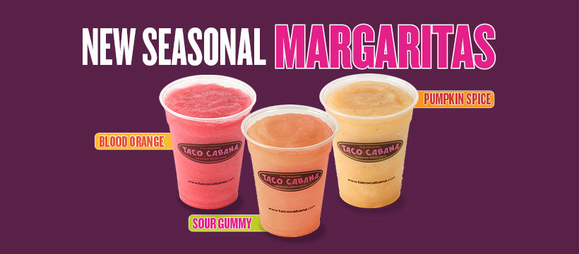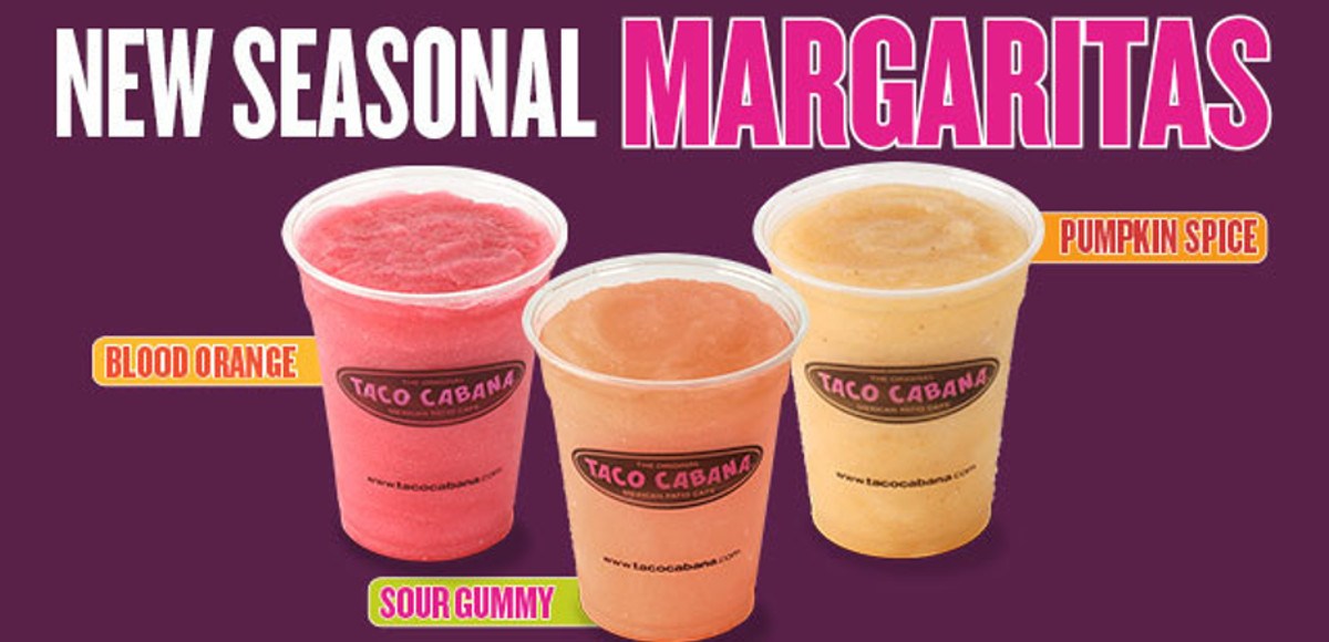 SAN ANTONIO, Texas — Just in time for fall, Taco Cabana is launching three new seasonal margarita flavors. Starting today, guests can enjoy Pumpkin Spice, Sour Gummy and Blood Orange frozen margaritas
