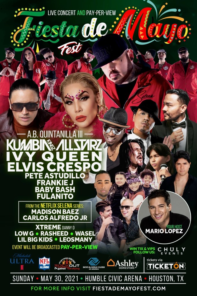 Fiesta de Mayo Fest will feature the biggest international artists such as A.B. Quintanilla III y Los Kumbia Kingz Allstarz featuring Pete Astudillo, Elvis Crespo, Ivy Queen, Frankie J, Baby Bash, Fulanito, Xtreme, Lil Big Kids, Leosmany, Low G, Rasheed and from the Netflix Selena series Madison Taylor Baez and Carlos Alfredo Jr., all hosted by Mario Lopez.