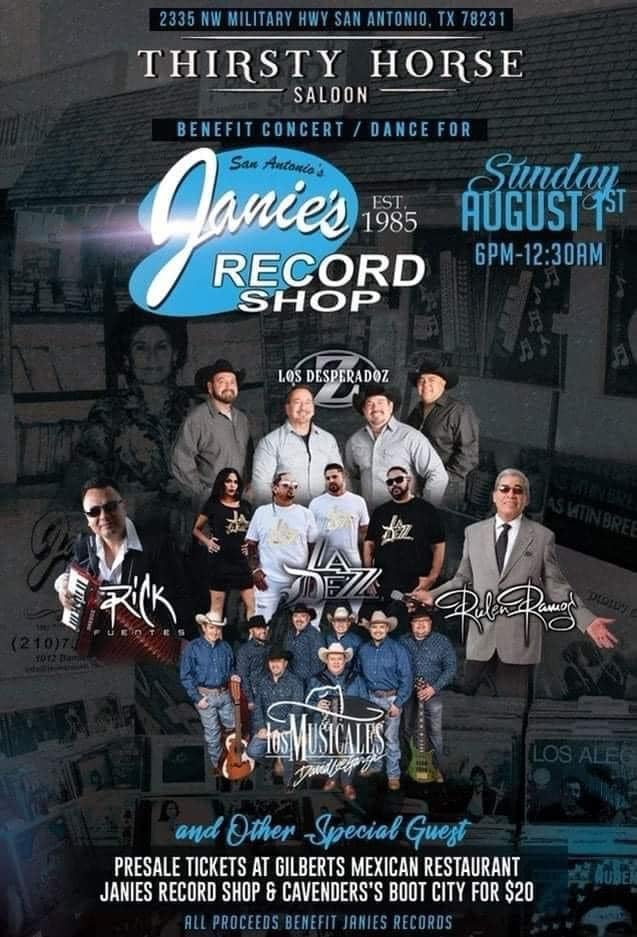 In honor of Janie, the 36th anniversary of Janie’s Record Shop, and her dedication to the Tejano and Conjunto music genres, artists will perform from 6 p.m. to 12:30 a.m., on Sunday, Aug. 1, 2021, for a benefit concert. The event at Thirsty Horse Saloon, 2335 N.W. Military Hwy, in San Antonio, will feature the following artists: David Lee Garza y Los Musicales, Ruben Ramos, Los Desperadoz, LaDezz, Rick Fuentes, and several special guests. Pre-sale tickets are available for $20 at Gilbert’s Mexican Restaurant, Janie’s Record Shop, and Cavender’s Boot City. All proceeds will benefit Janie’s Record Shop.