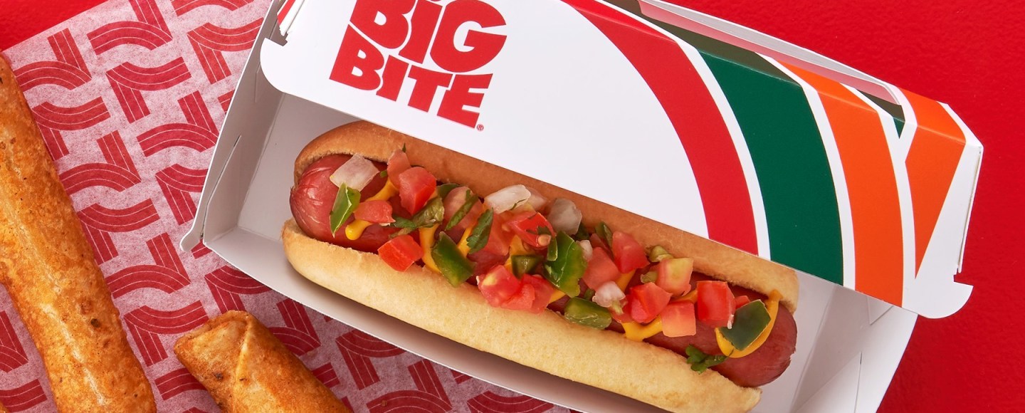 7-Eleven sells more than 100 million hot dogs each year, making it one of the country’s top hot dog sellers. Maybe that’s because 7-Eleven customers know they can build the Big Bite of their dreams at 7-Eleven stores with a wide variety of condiments and toppings. Hot chili, melted nacho cheese, fresh onions, jalapeños, and pico de gallo or classics like ketchup, mustard, relish, pickles, mayonnaise, and sauerkraut are included with each Big Bite hot dog purchase. Selections vary by store.