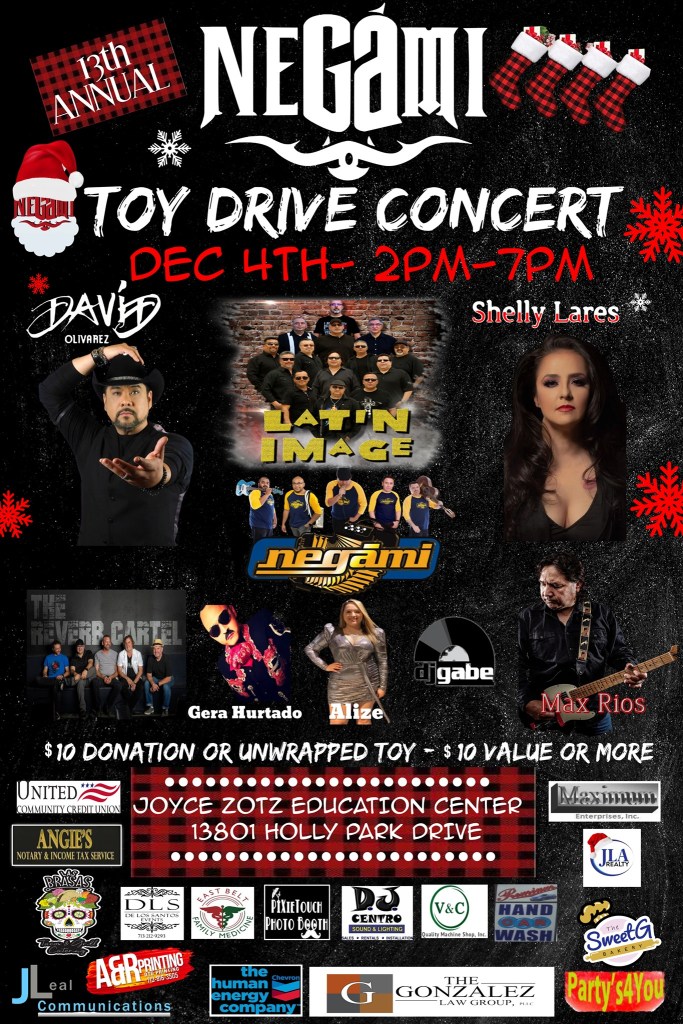 HOUSTON, TX – Tejano artists Negami, Shelly Lares, David Olivarez, Gera Hurtado, Alize Nino, DJ Gabe, Max Rios, Latin Image, and rock band The Reverb Cartel, come together for the 13th Annual Negami Toy Drive Concert, benefiting underprivileged children in local communities on Saturday, December 4, 2021, in Houston, Texas.