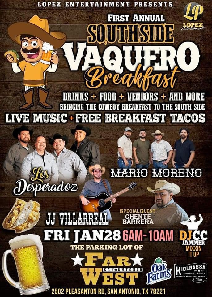 Rodeo season in San Antonio will kick off with the inaugural Southside Vaquero Breakfast on the morning of Friday, Jan. 28, with free food and live music from Los Desperadoz, Mario Moreno, JJ Villarreal, and special guest Chente Barrera.