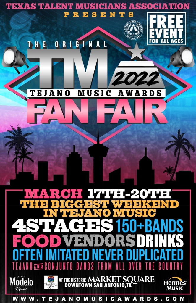 SAN ANTONIO, TX — The Tejano Music Awards Fan Fair is back and with Tejano music, better and brighter than ever. The Texas Talent Musicians Association (TTMA) presents the Tejano Music Awards FanFair 2022 for March 17-20, 2022 (Friday-Sunday). Fans from all over the country will travel to the heart of Tejano music, downtown San Antonio, to celebrate this cultural genre at the historic Market Square.