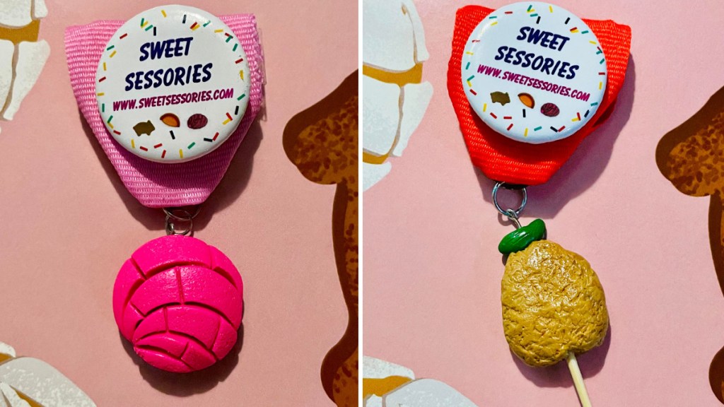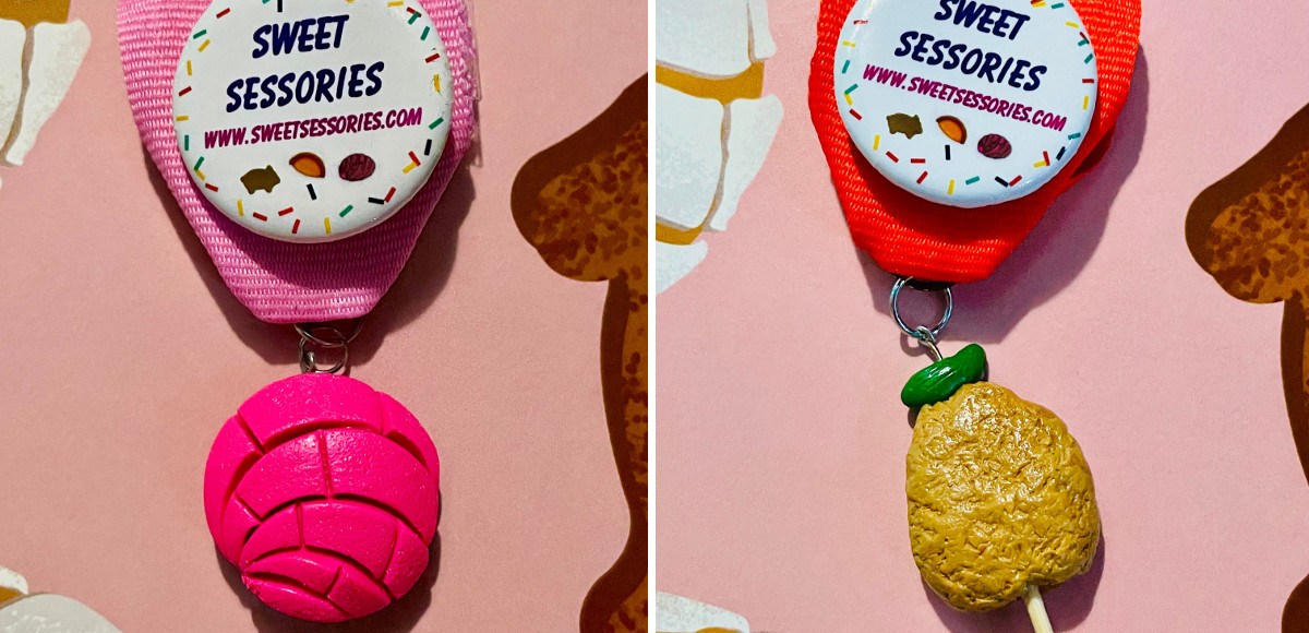 Brenda’s latest seasonal collection is in honor of San Antonio’s famous Fiesta celebration and the iconic and collectible medals that are hallmarks of the event. The Sweet Sessories Fiesta medal collection features her trademark handmade polymer clay miniature conchitas, marranitos, and chicken on a stick.