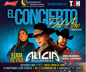 Tickets for El Concierto del Año are available at EventMania.com or at both Big House Burgers & BBQ in Kingsville. $30.00 for presale General Admission. $80.00 for VIP that includes front stage seating, private restrooms, bar and waitress, and a collectible VIP Badge. Gates open at 4 p.m. at JK Northway Event Center, located at 501 E Escondido Road in Kingsville, Texas. For more information call Quartermoon Productions at 979-665-1923.