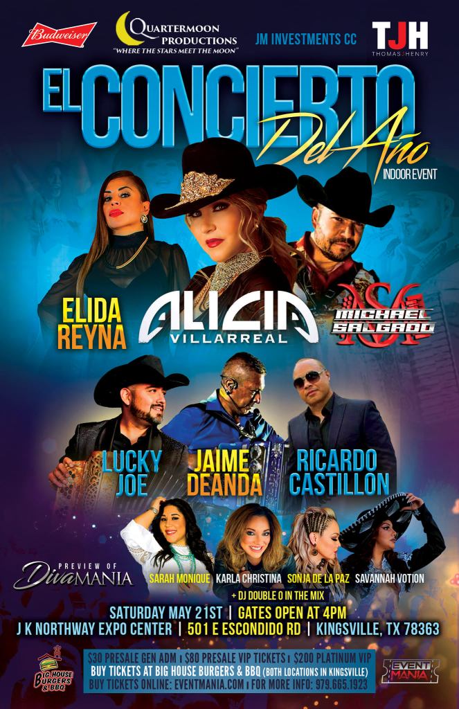 KINGSVILLE, TX — El Concierto del Año (The Concert of the Year) will feature performances from Alicia Villarreal, Elida Reyna, Michael Salgado, Lucky Joe, Jaime DeAnda, Ricardo Castillon, and a preview of the history-making DivaMania concert with Sarah Monique, Karla Christina, Sonja De La Paz, and Savannah V. in Kingsville, Texas on Saturday, May 21, 2022.