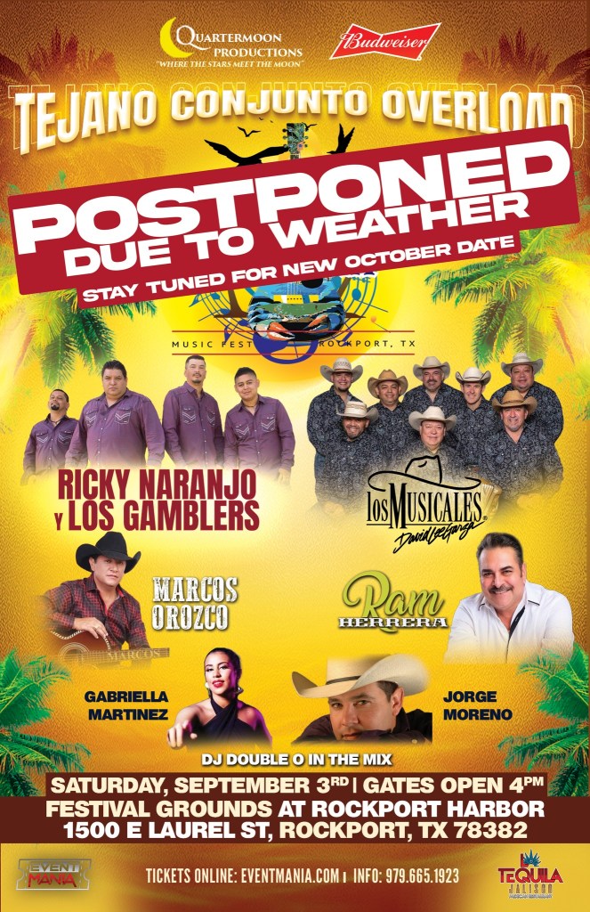 The Tejano Conjunto Overload concert scheduled for Saturday, September 3, in Rockport, Texas, has been postponed due to the possibility of severe weather.