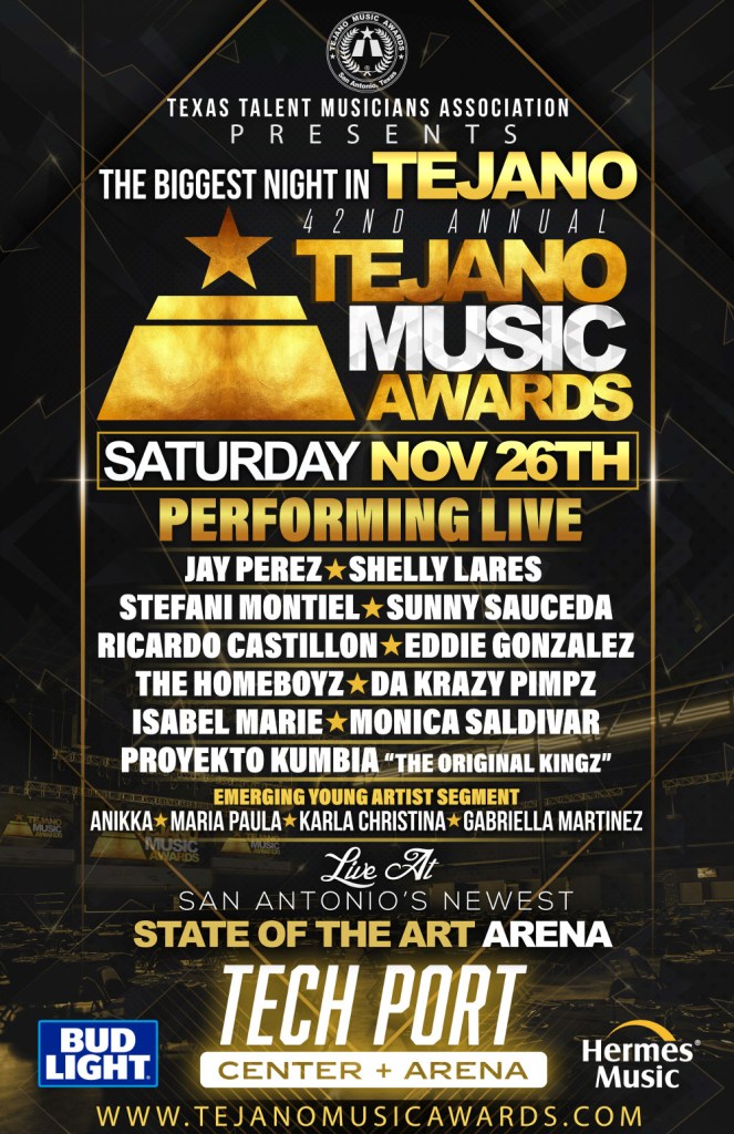 This year, the Tejano Music Awards will be held at the Tech Port Center + Arena featuring the final TMA performance by Tejano icon, “Little Miss Dynamite,” Shelly Lares, and more performances from “The Voice” Jay Perez, Isabel Marie, Sunny Sauceda, Stefani Montiel, Ricardo Castillon y La Diferenzia, The Homeboyz, Eddie Gonzalez, Monica Saldivar, Da Krazy Pimpz, Proyekto Kumbia “Los Original Kings,” and more to be announced. Performances are subject to change.