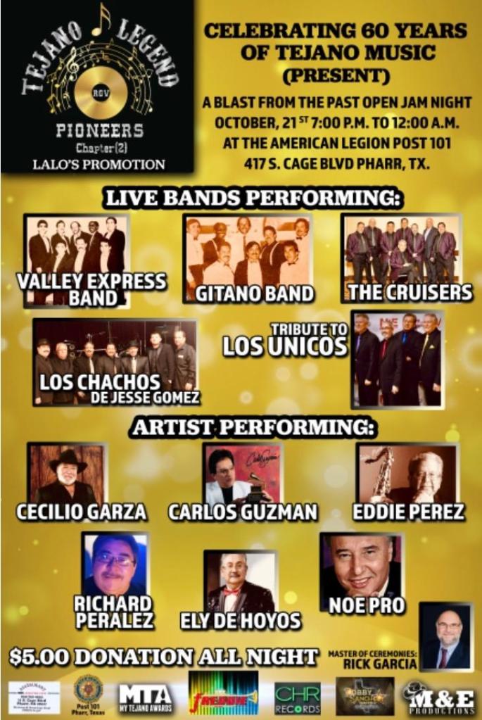 PHARR, TX — The Rio Grande Valley Chapter of the Tejano Legend Pioneers Organization will celebrate 60 years of Tejano music with a Blast From The Past Open Jams Night on October 21 in Pharr, Texas.