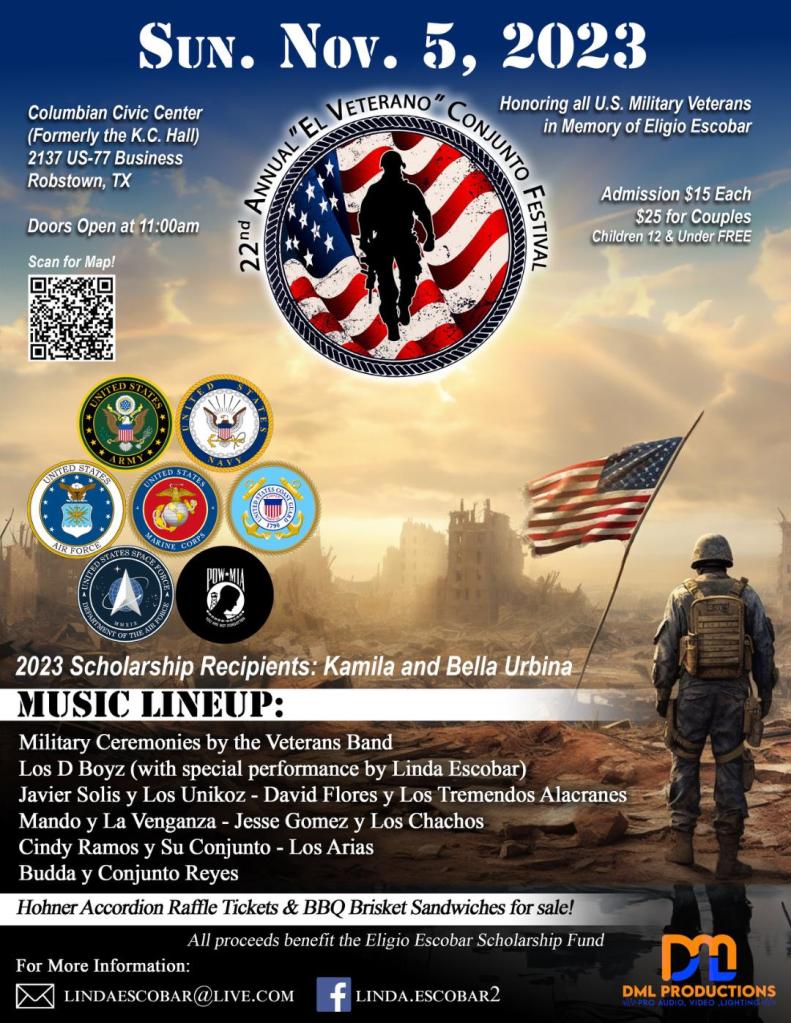 If you love conjunto music and want to support a good cause, don’t miss the 22nd annual El Veterano Conjunto Festival on Sunday, Nov. 5, 2023, at Columbian Civic Center (formerly KC Hall), 2137 US-77 Bypass in Robstown, Texas. The festival honors all US Military Veterans in memory of Conjunto legend Eligio Escobar, father of “La Reina de Conjunto music” Linda Escobar.