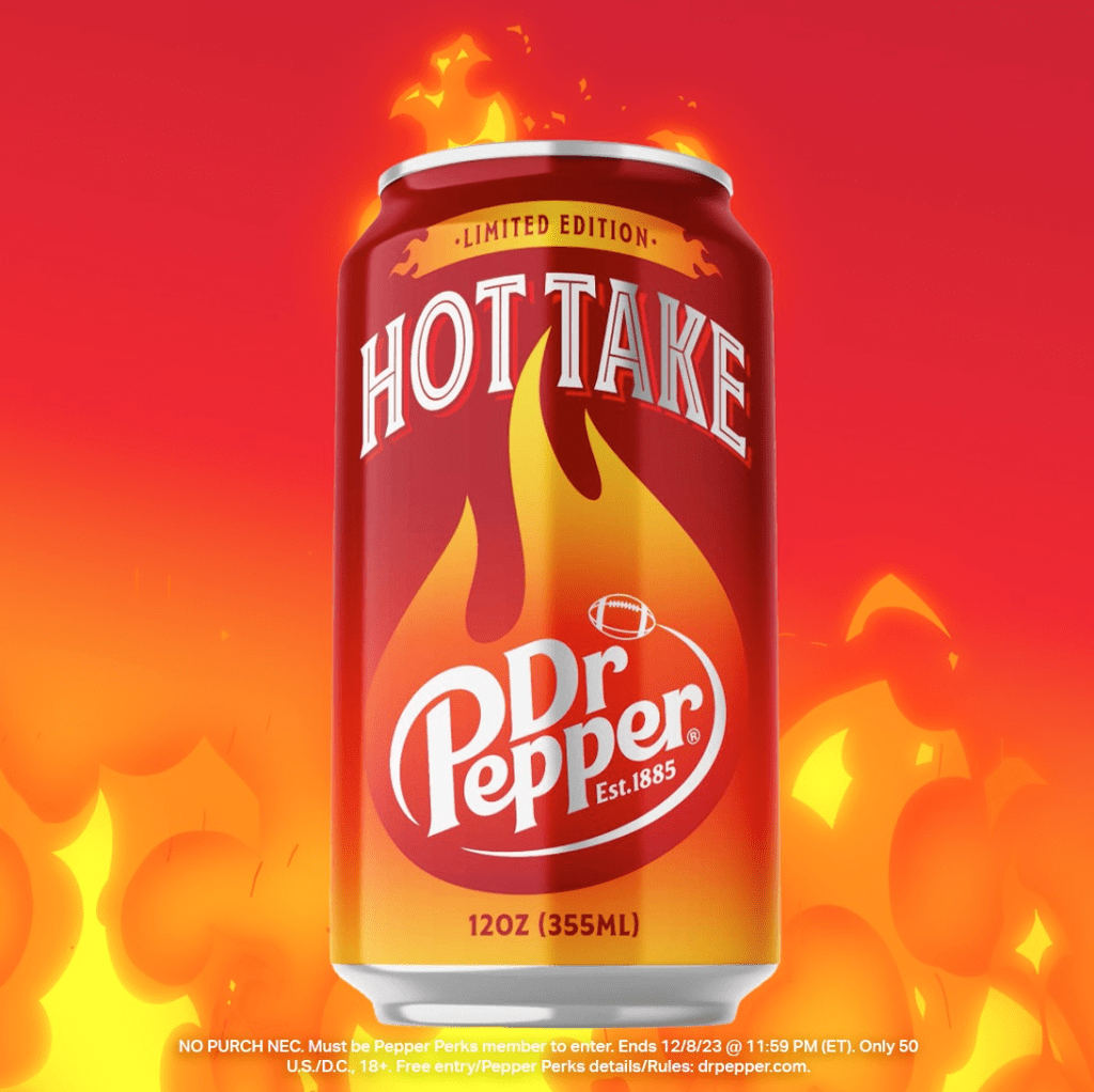 FRISCO, Texas — (PRNewswire) — Dr Pepper revealed the 2023 limited-edition flavor of the beloved soft drink with the launch of Dr Pepper Hot Take, available exclusively to Pepper Perks members beginning November 8. Dr Pepper Hot Take is a fiery turn on the original 23 flavors, harnessing the bold flavors of spicy peppers and honoring the sport and all of the hot takes that come with college football fandom.