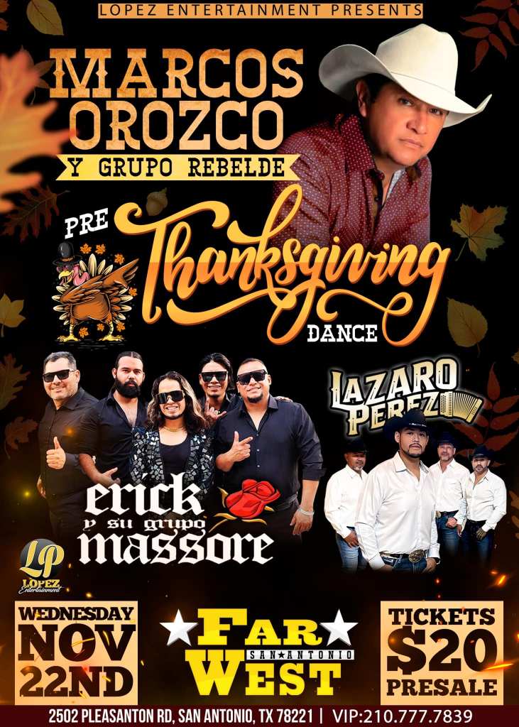 If you’re looking for a fun and festive way to celebrate Thanksgiving Eve, look no further than the Pre-Thanksgiving Dance at Far West San Antonio. This event, presented by Lopez Entertainment, will feature live performances by Marcos Orozco, Erick Y Su Grupo Massore, and Lazaro Perez. These artists are known for their energetic and catchy songs that will make you want to hit the dance floor.