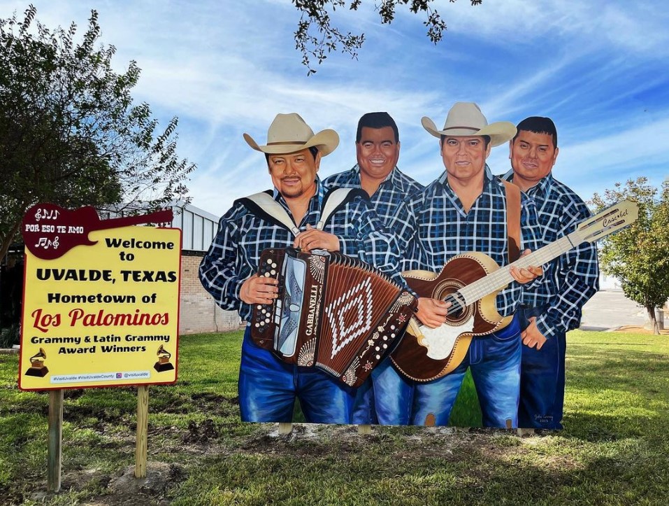 Los Palominos, the Grammy-winning Tejano band, has been honored with a wooden art piece in their hometown of Uvalde, Texas. The art piece is one of three 12 to 18 feet high wooden art pieces spread around the south Texas town, that also depict Oscar winner Matthew McConaughey and singer-songwriter and actress Dale Evans.