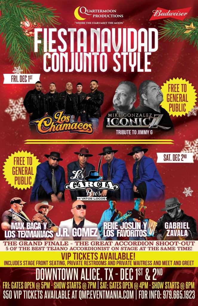 If you love Tejano and Conjunto music and want to enjoy a festive holiday atmosphere, you don’t want to miss Fiesta Navidad Conjunto Style, a two-night event presented by Quatermoon Productions in downtown Alice, Texas. This spectacular show will feature some of the best Tejano artists and Conjunto bands, as well as a tribute to the late Jimmy Gonzalez and a grand finale accordion shootout. Here are the details of this amazing event: