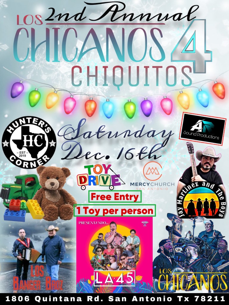 The 2nd annual Los Chicanos 4 Chiquitos Toy Drive will take place on Saturday, Dec. 16, 2023, at Hunter’s Corner, 1806 Quintana Road in San Antonio, Texas. The event will feature performances from Los Chicanos, La 45, Los Banger Broz, and Jay Martinez and The Boys. Admission is free with one toy per person.
