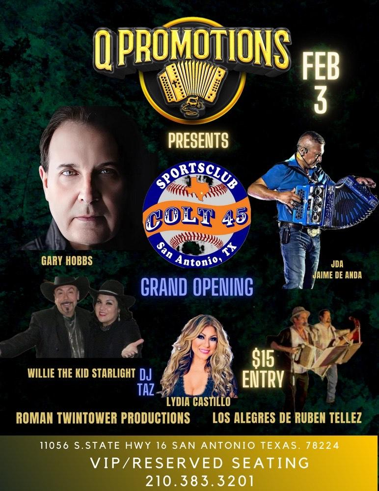The grand opening is presented by Q Promotions and Roman Twin Tower Productions. Don’t miss this opportunity to support a new Tejano venue and enjoy some of the best artists in the industry. See you at Colt 45 Sports Bar!
