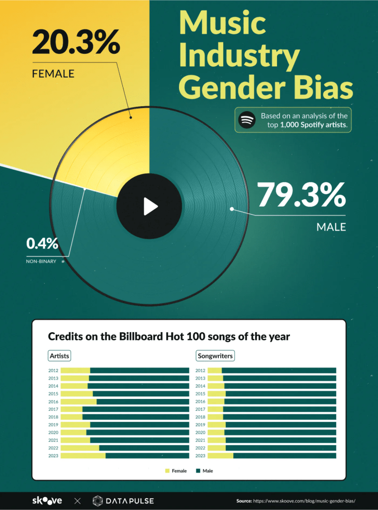 - Representation in Charts: Women account for only 20% of the top 1,000 Spotify artists and only a third of artists on the Billboard Hot 100 songs of the year.
