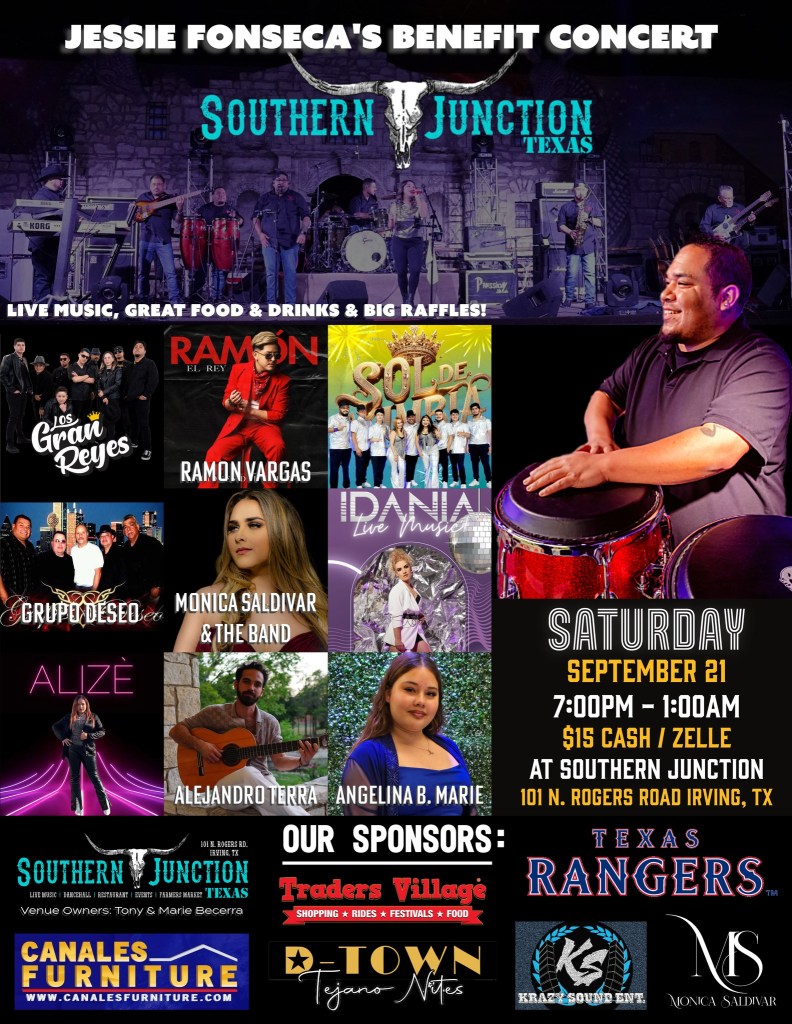 Monica Saldivar & The Band are coming together to support their cherished percussionist, Jessie Fonseca, who suffered a stroke on July 21st and has been hospitalized since. To help cover Jessie’s medical expenses, a benefit concert with a $15 cover charge will be held on Saturday, September 21, 2024, from 7:00 p.m. to 1:00 a.m. at Southern Junction in Irving, Texas.