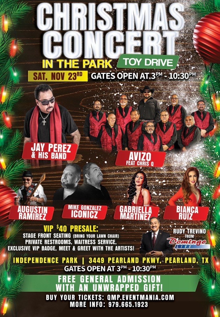 Get ready for a heartwarming holiday event as the Christmas Concert in the Park Toy Drive takes center stage at Independence Park in Pearland, Texas, on Saturday, November 23, 2024. This festive concert features an incredible lineup of Tejano stars, including performances by Jay Perez, Avizo featuring Chris Quiroga, Augustin Ramirez, Mike Gonzalez and The Iconiczz, Gabriella Martinez, and Bianca Ruiz. Adding to the excitement, Rudy Treviño, host of “Domingo Live” and “Tejano Gold Countdown,” will make a special appearance.