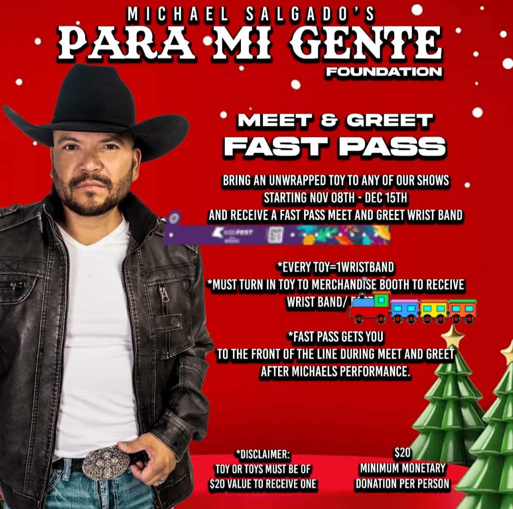 Beyond his musical achievements, Michael Salgado continues to give back to the community through his Para Mi Gente Foundation. The foundation’s annual toy drive, running from November 8 to December 15, collects toys and monetary donations for less fortunate children. Fans who donate at Salgado’s tour dates will receive a Fast Pass Meet and Greet Wristband, allowing them to skip the line for a personal meet and greet with the artist after his performances. Each toy donation valued at $20 or a $20 monetary donation per person qualifies for a wristband, which can be obtained at the merchandise booth.