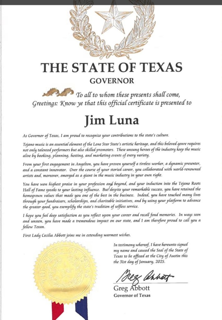 Tejano music promoter Jim Luna, known for his tireless dedication to showcasing the biggest Tejano legends and emerging artists, has been recognized by Texas Governor Gregg Abbott for his remarkable 46-year career in producing iconic Tejano events. The Texas Governor honored Luna with a proclamation that praised his invaluable contributions to the state’s cultural fabric.