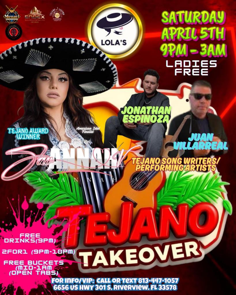 The Florida Tejano Takeover will be held on Saturday, April 5, at Lola’s (6656 US Hwy 301 S, Riverview, Florida). Ladies get in free all night! For VIP information, call or text 813-447-1057. Don’t miss this unforgettable celebration of Tejano music and culture!