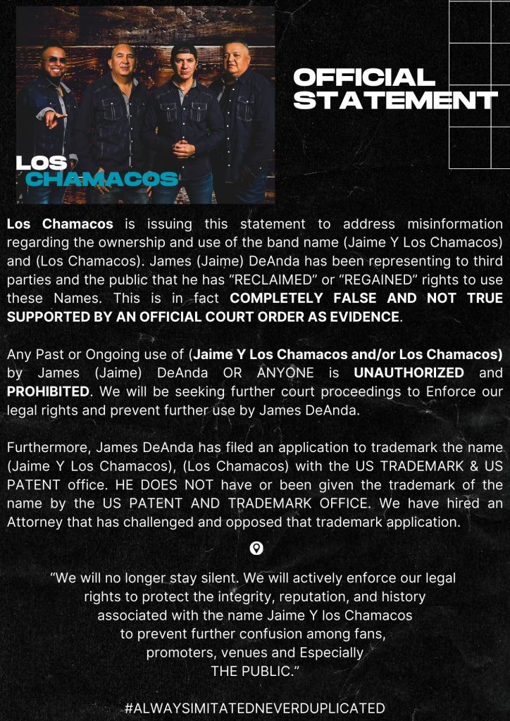 “Any past or ongoing use of ‘Jaime y Los Chamacos’ or ‘Los Chamacos’ by James (Jaime) DeAnda or anyone else is unauthorized and prohibited,” the statement said. “We will be seeking further court proceedings to enforce our legal rights and prevent further use.”