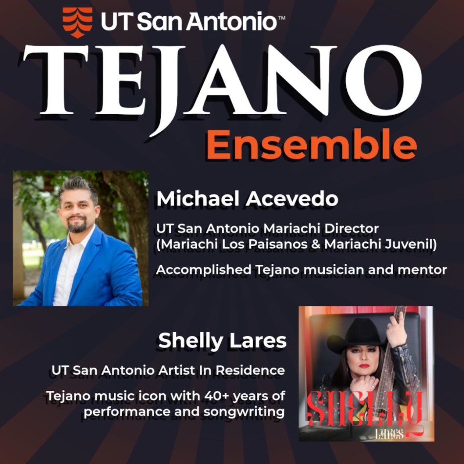 Leading SONIDO TEJANO is Tejano Music Legend Shelly Lares, a trailblazer with more than four decades in the industry and UTSA’s first Artist in Residence. Joining her is Michael Acevedo, UTSA’s Mariachi Director, founder of Mariachi Los Paisanos and Mariachi Juvenil, and an accomplished Tejano musician and mentor in his own right. Together, they bring decades of professional performance experience directly into the classroom.