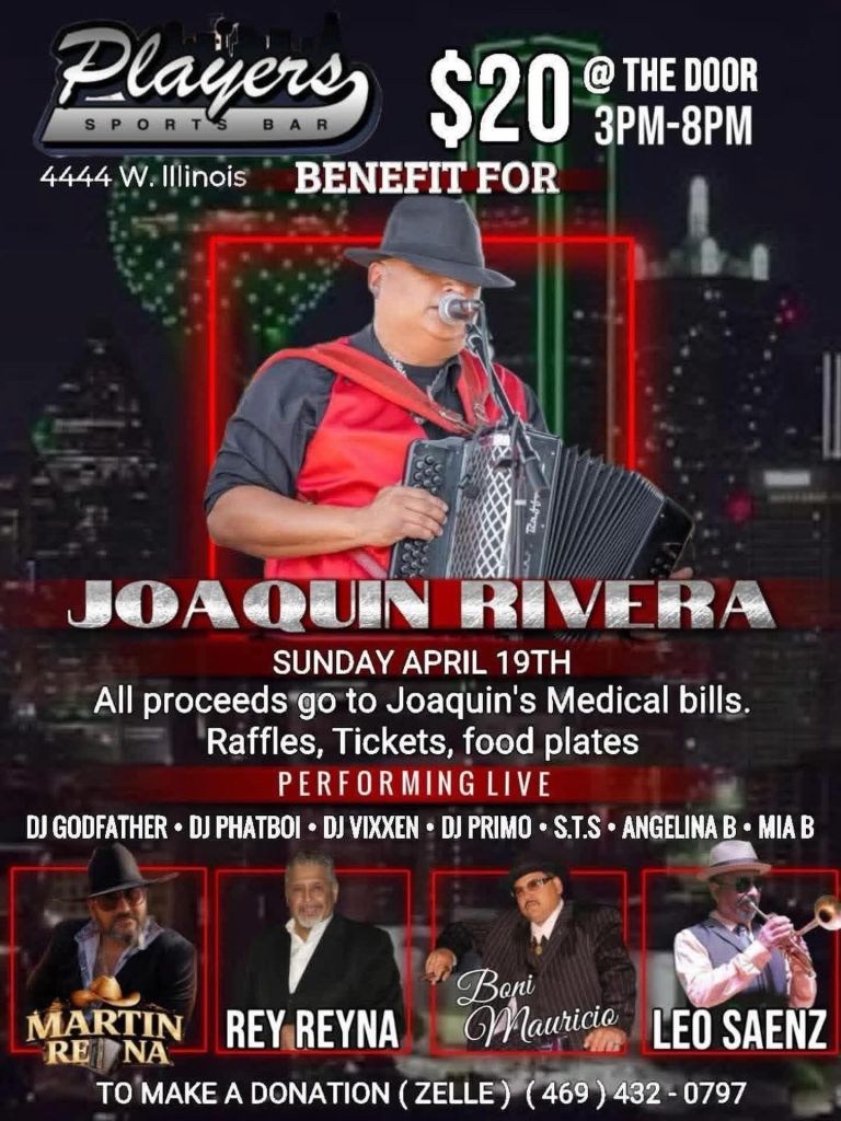 A benefit event is scheduled for Sunday, April 19, at Players Sports Bar at 4444 W. Illinois in Dallas. The event will take place from 3 p.m. to 8 p.m., with a $20 donation at the door. All proceeds will go toward Rivera’s medical and family expenses. The event will feature live performances and appearances by artists and DJs including Martin Reyna, Rey Reyna, Boni Mauricio, Leo Saenz, DJ Godfather, DJ Phatboi, DJ Vixxen, DJ Primo, S.T.S., Angelina B, and Mia B. Raffles, tickets, and food plates will also be available, with additional donations accepted via Zelle.