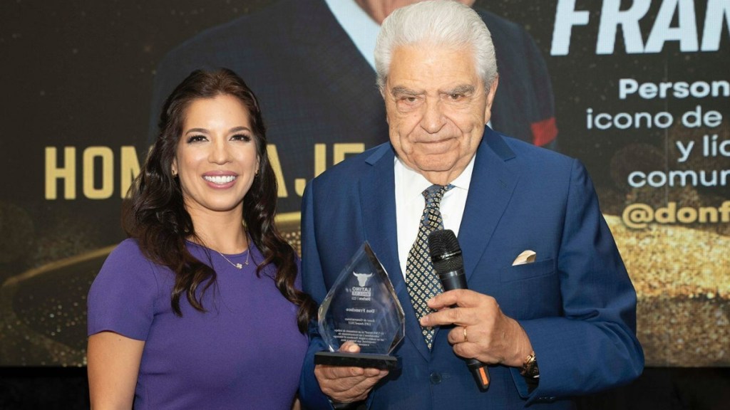 Gabriela Berrospi, founder of Latino Wallstreet, presented the ‘Icon of Generations’ Award to Don Francisco, who was also recognized by Miami Dade County